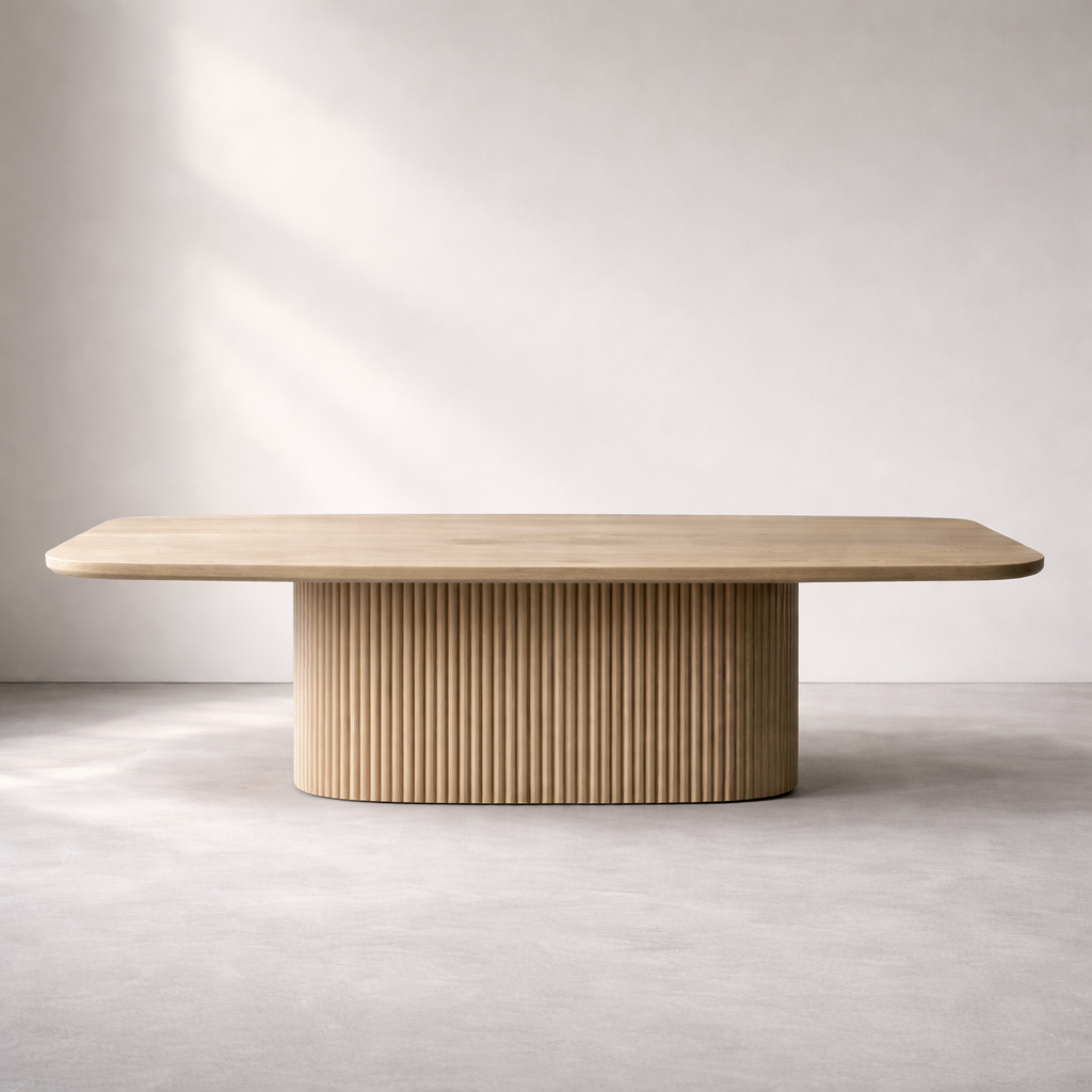 La cubierta de encina y las base pedestal en palillaje roble americabo, crean una atmósfera natural, cálida y atemporal.