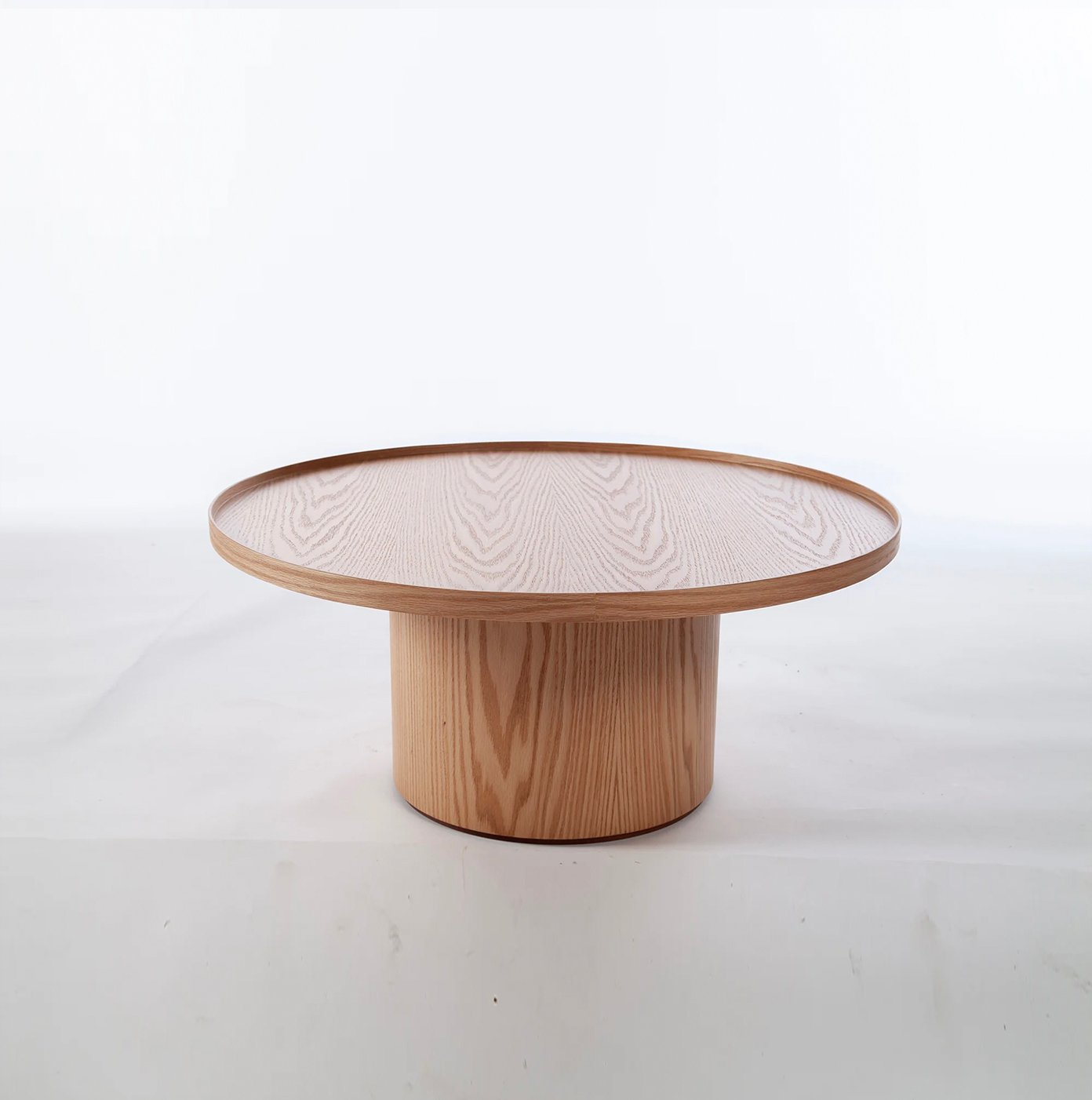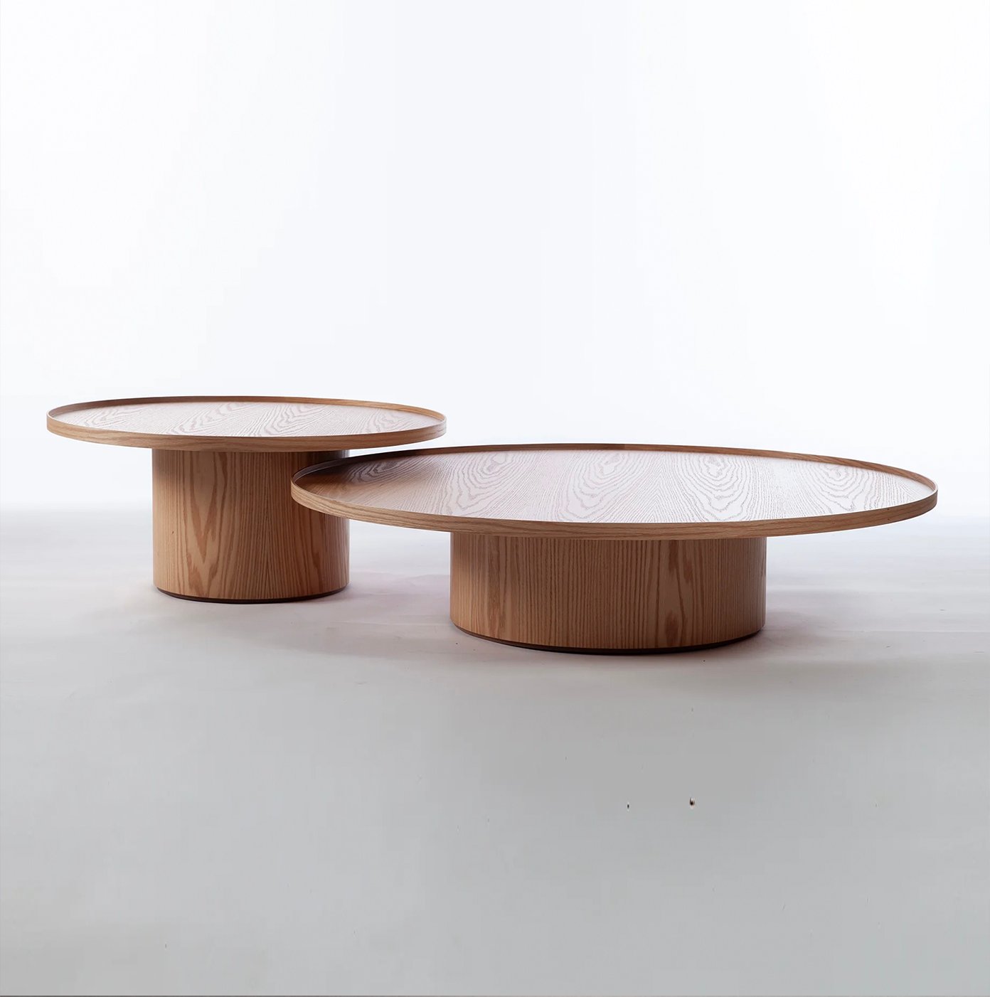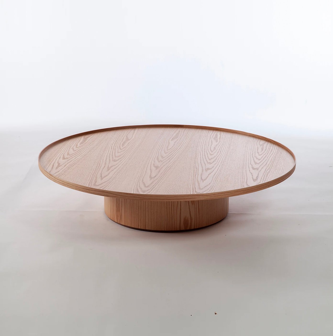 Mesas de Centro, base cilindrica en encina con cubierta con reborde tipo bandeja.