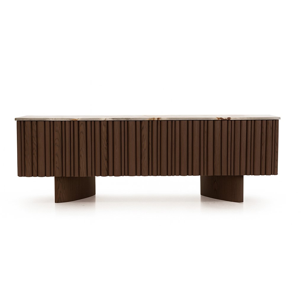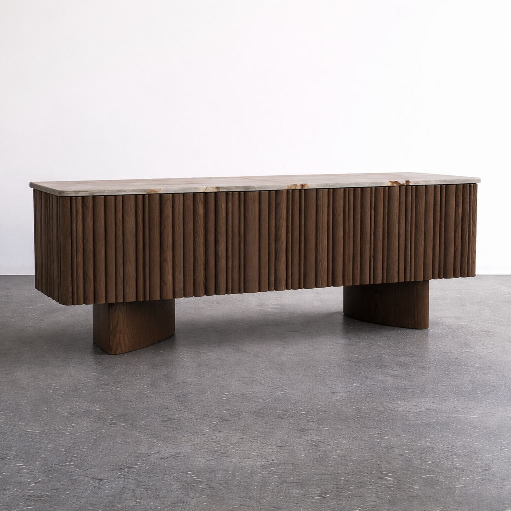 Definido por su puertas torneadas 100% realizada a mano, su cubierta en cuarcita blue roma y su forma con terminaciones redondas y líneas simples, el mueble  BOREAL es una hermosa solución de almacenamiento y exhibición. Elaborado en madera acabado natural nogal o negro. Diseñado con 4 puertas y 2 repisas interiores regulables para entregar mayores posibilidades de organización.