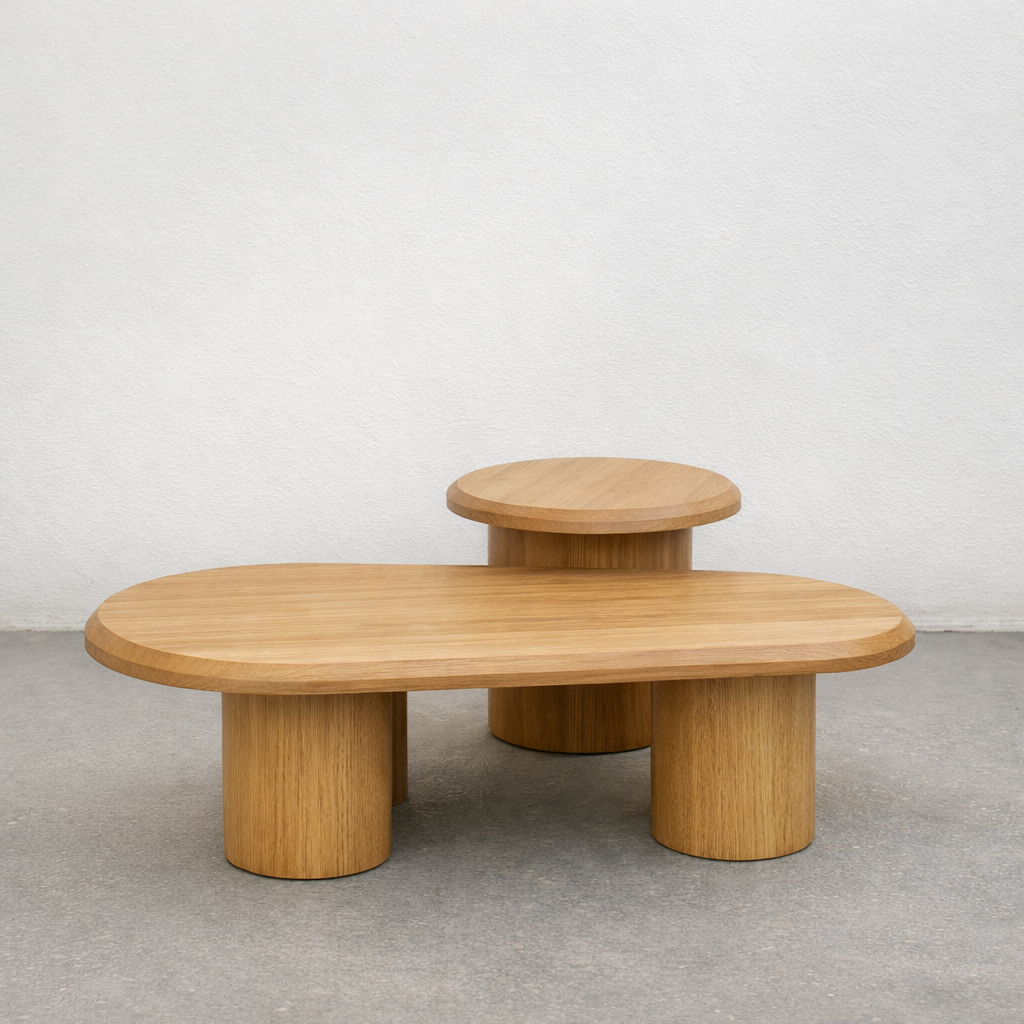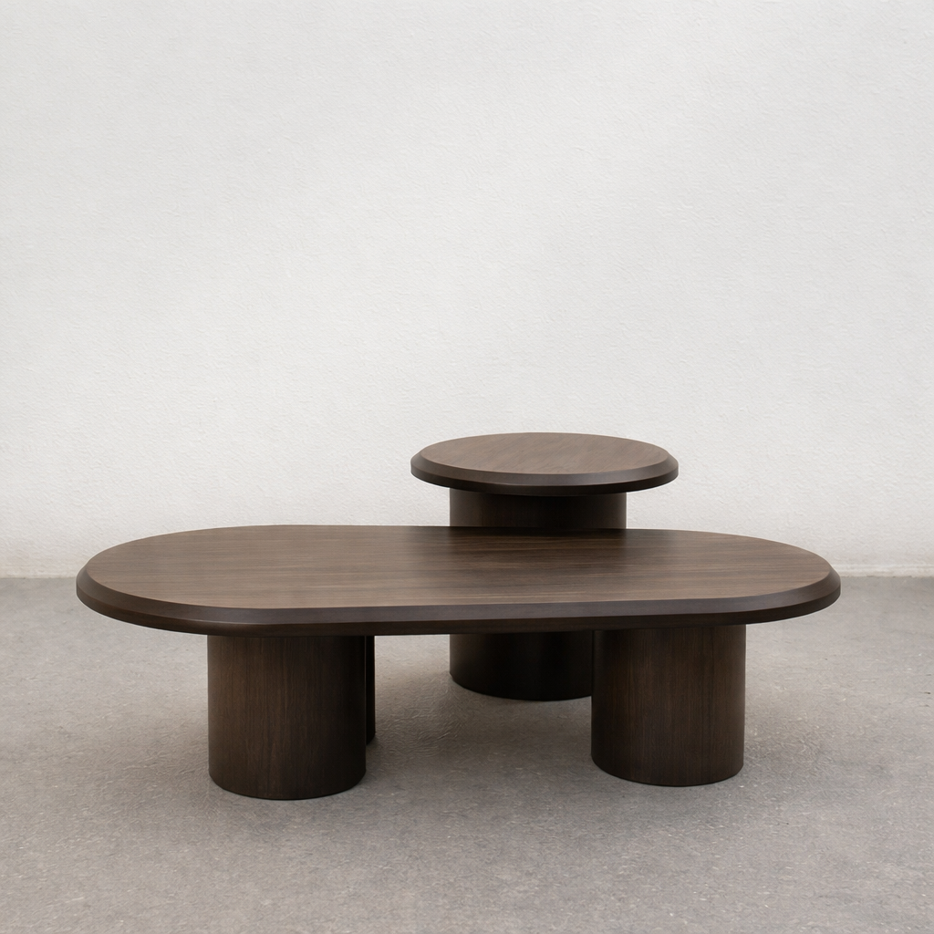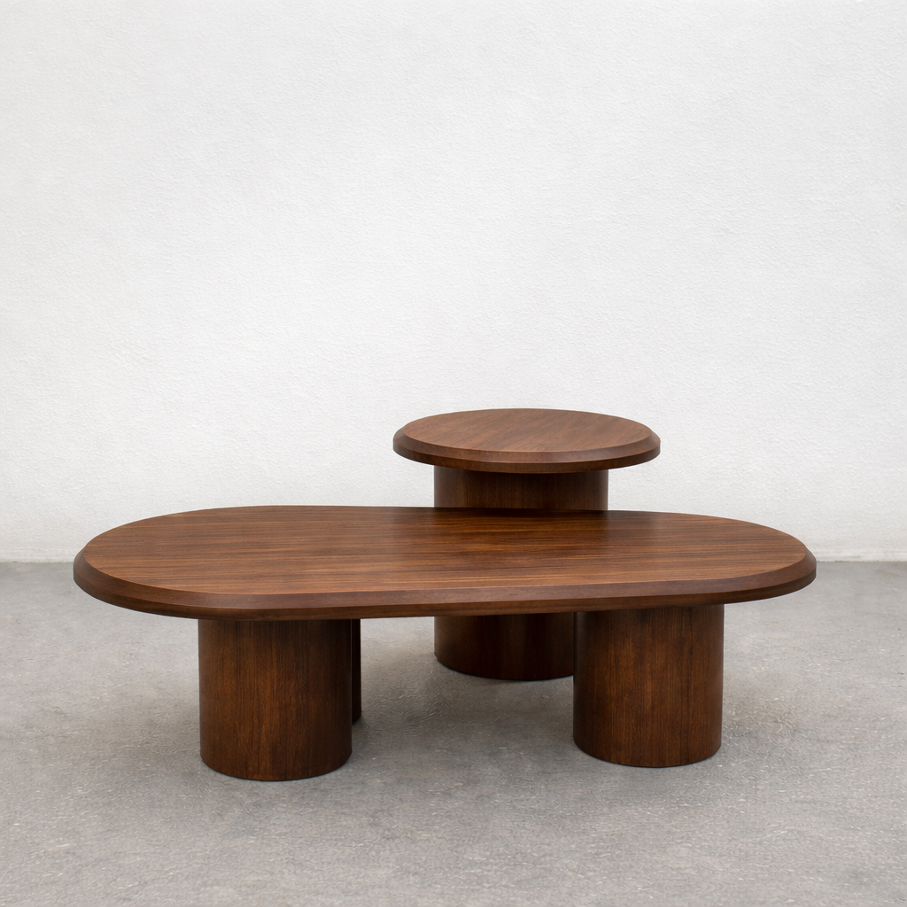 Par de mesas de centro con cubierta y patas cilíndricas sólidas; esta combinación de formas orgánicas y artesanía robusta agrega un toque distintivo a los espacios contemporáneos.