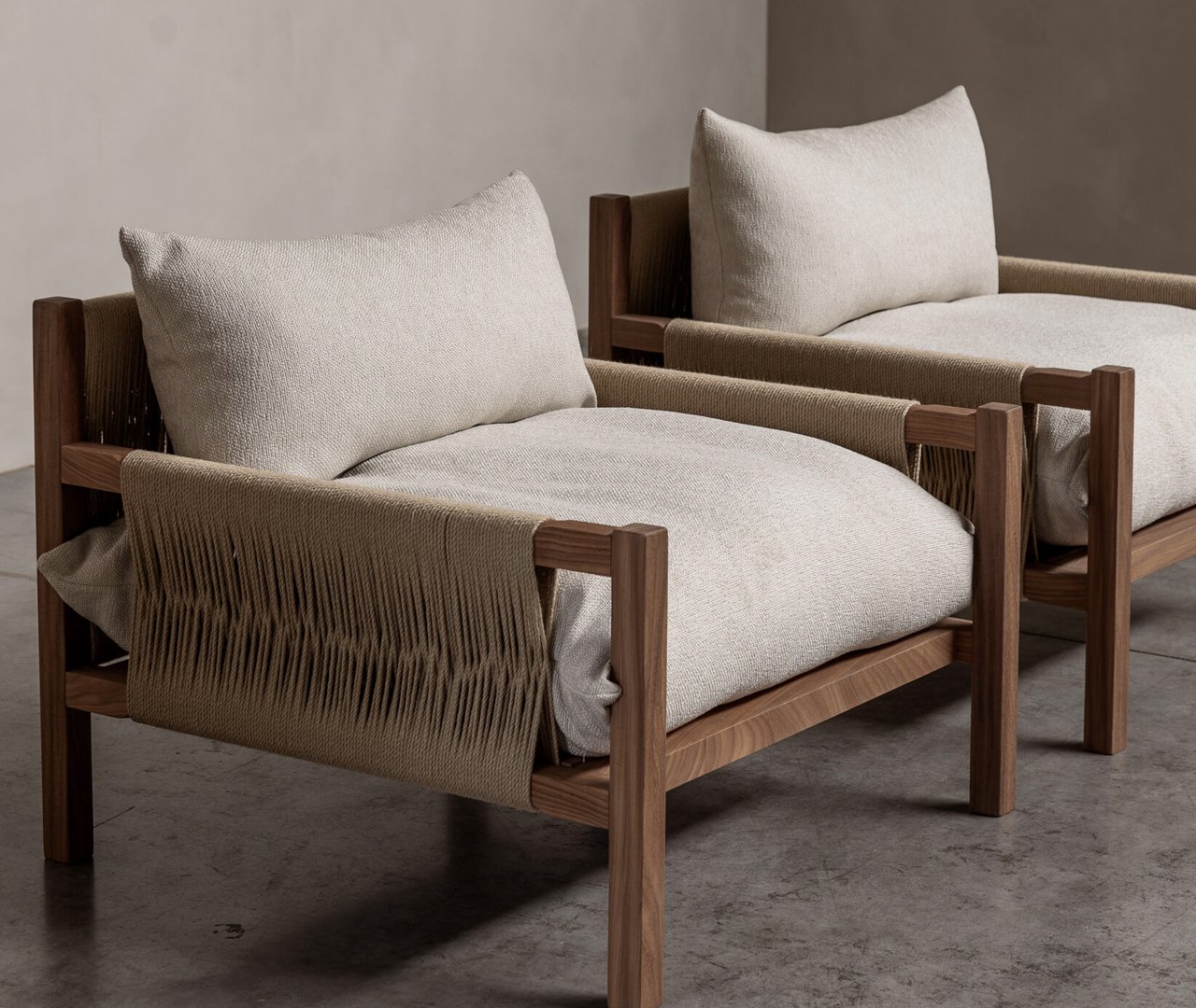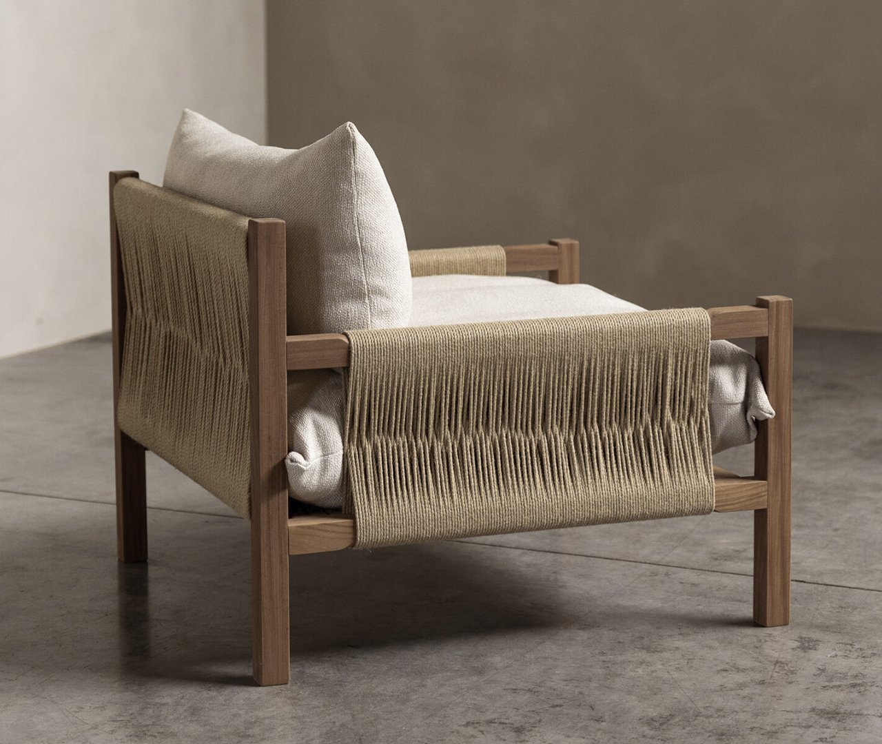Sitial 100% madera roble americano ideal interior y exterior, cojineria lino algodon y yute trenzado.